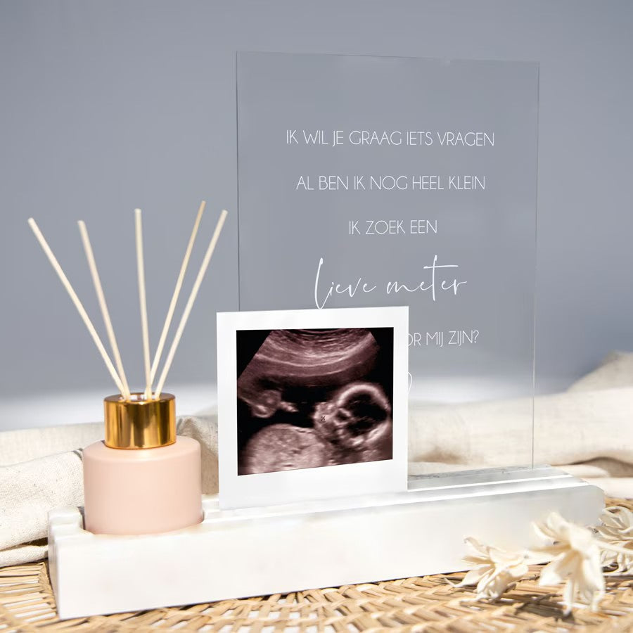 Personaliseer de plexi plaat met je eigen tekst en kies een leuke foto voor op het fotokaartje.